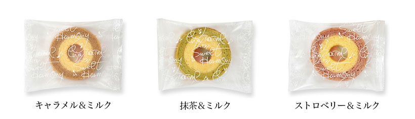 商品名:2層バームクーヘン(キャラメル&ミルク)・2層バームクーヘン(抹茶&ミルク)・2層バームクーヘン(ストロベリー&ミルク)